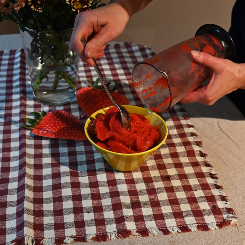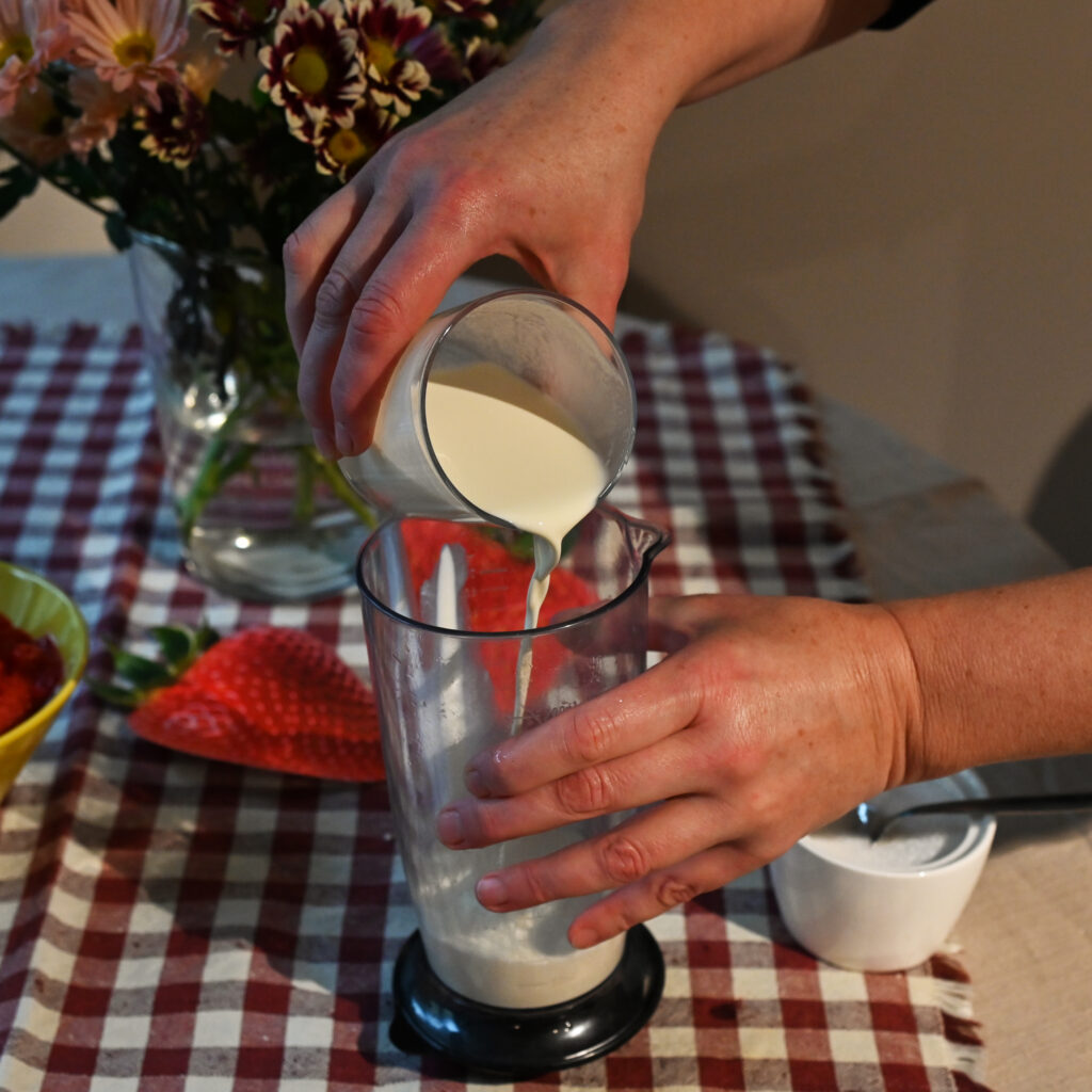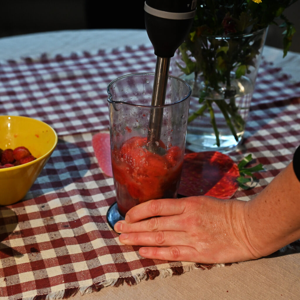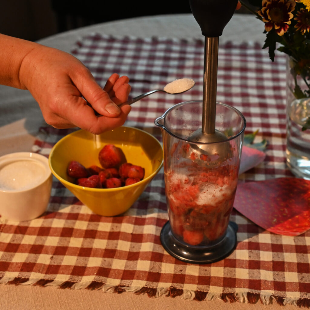Zemenes kopā ar pusotru ēdamkaroti cukura liec blenderī. Ja visas zemenes blenderī uzreiz nesatilpst, nedaudz sablendē tās.