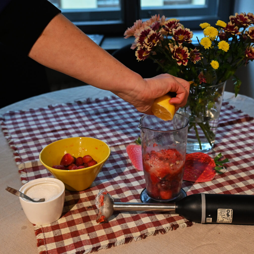 Pārgriez cirtonu uz pusēm un piespied tā sulu klāt zemenēm.