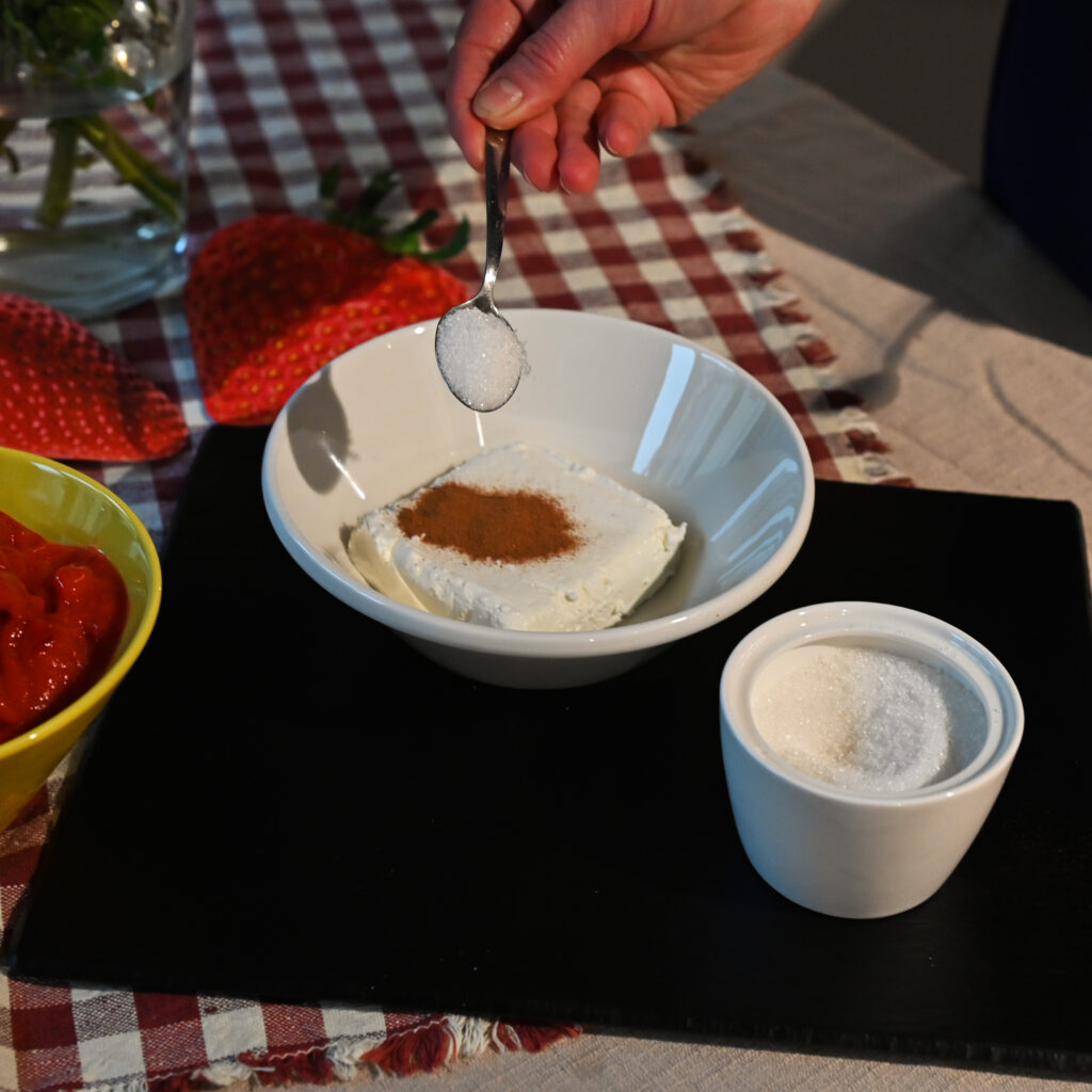 Citā traukā liec biezpienu kopā ar tējkaroti kanēļa un ēdamkaroti cukura.