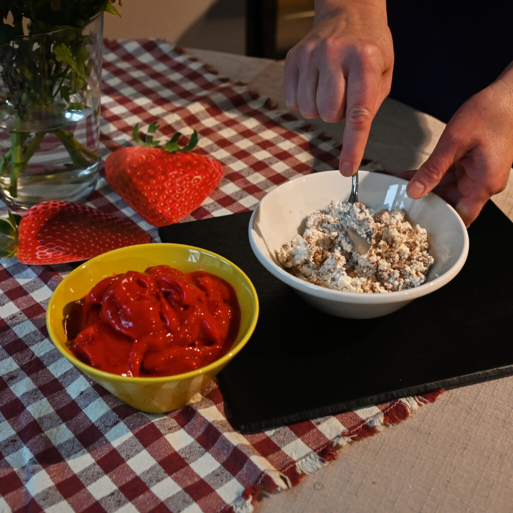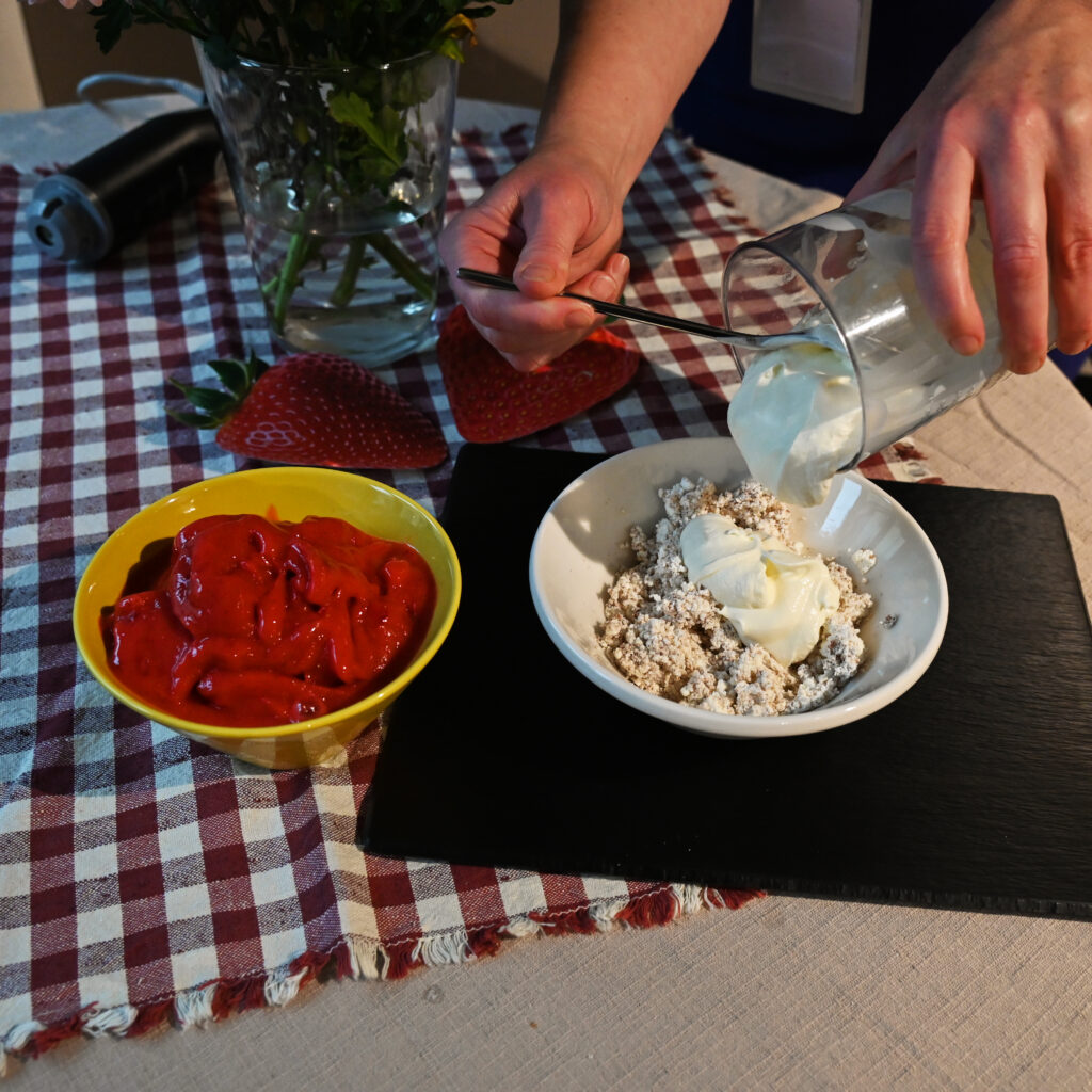 Nelielā bļodiņā vai trauciņā no sākuma liec zemeņu zupu un pa virsu liec biezpiena krēmu. Gatavs!